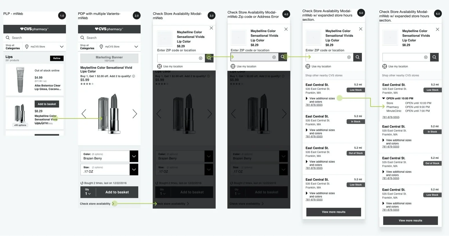 Check Store availability was a project to develop a feature allowing users to get a real-time snapshot of the inventory levels of online and in-store products. The age 35–55 demographic accounts for 39% of CVS customers, a feature that would positively affect over 9000 stores nationwide and, on the backend, become an additional resource for the Buying and Allocations team.